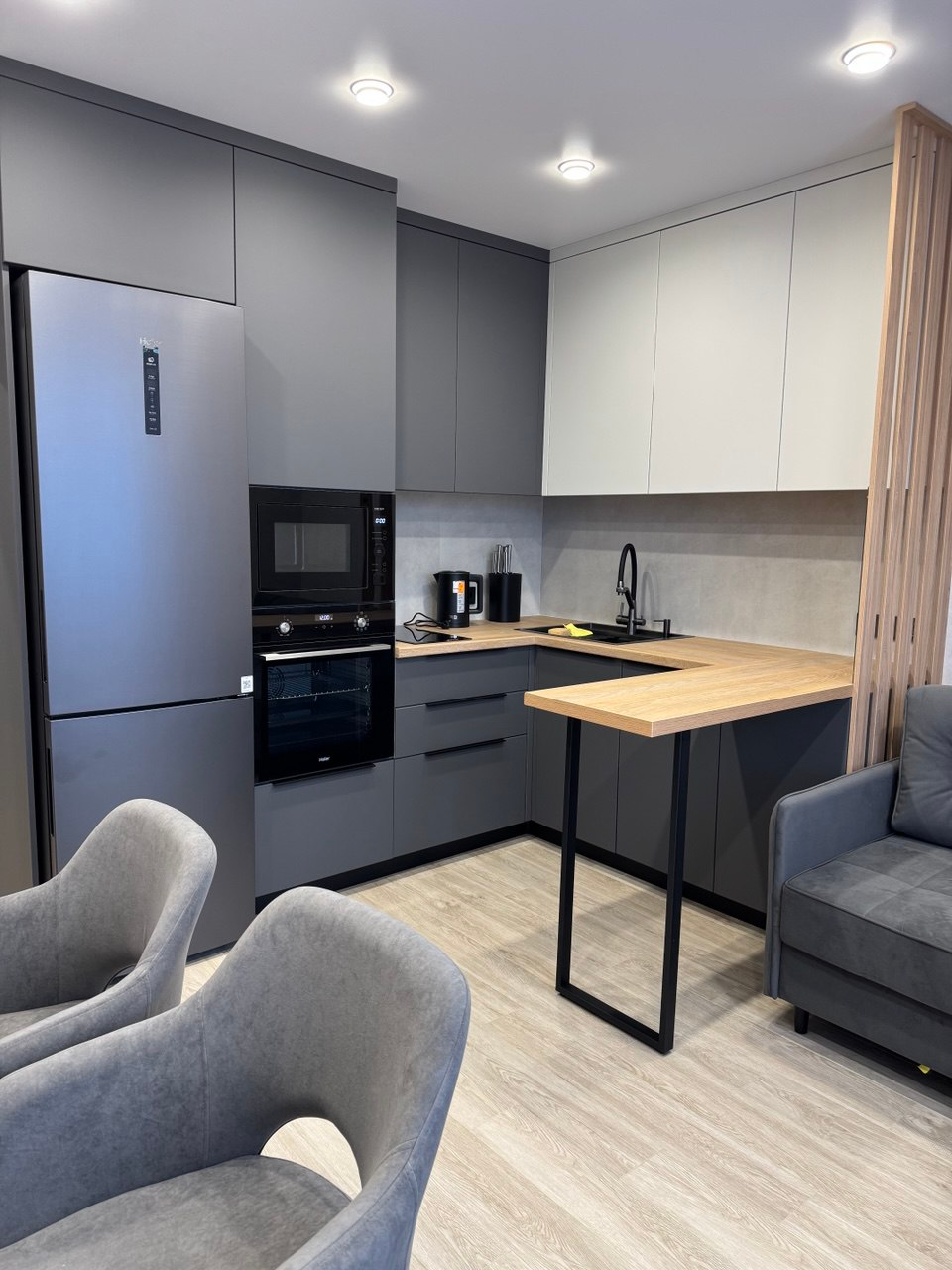 У нас это работает так: первоначальный взнос от 20%, срок до двенадцати месяцев без переплат, оформление онлайн за пятнадцать минут. Кухню начинаем делать сразу после первого платежа.