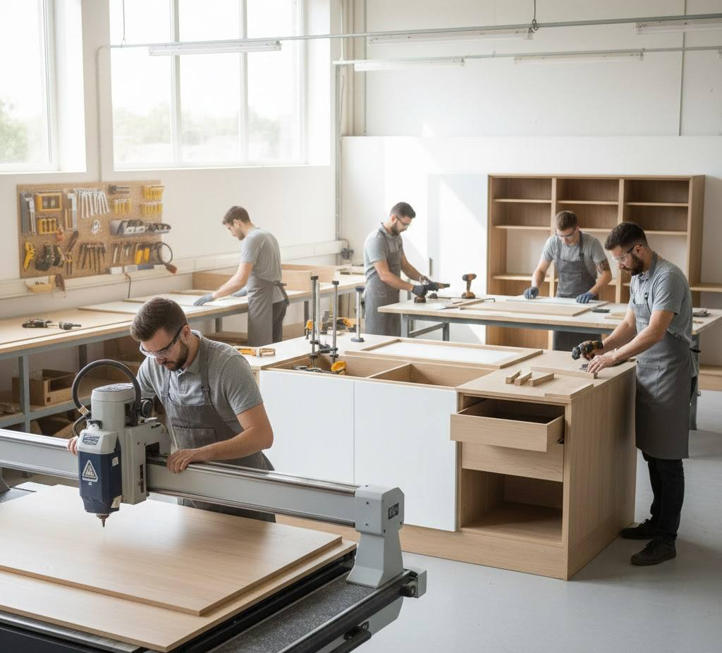 Кухня должна быть удобной не только внешне, но и функционально. Мы используем качественные фасады и столешницы, а также проверенную фурнитуру, чтобы кухня служила долго и оставалась удобной в повседневном использовании. Механизмы выдвижных ящиков и шкафов проходят контроль качества, а встроенная техника интегрируется без потери эргономики.